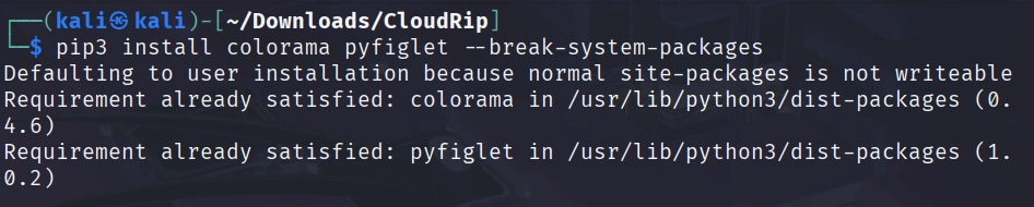 Now we need to install the dependencies. CloudRip requires only two Python libraries: colorama for colored terminal output and pyfiglet for the banner display.
