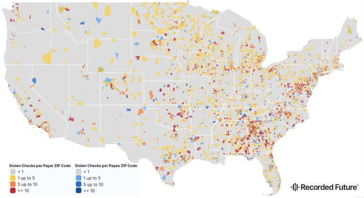In the past, stolen checks were often whitewashed to change the recipient and amount, and then walked into banks for cashout. The Postal Inspection Service received over 299,000 mail theft complaints in a single 12-month period—a 161% increase from the prior year. Recorded Future’s Fraud Intelligence Team analyzed and mapped stolen checks to US geographies, illustrating hot spots of physical crime and observing that it remains a national issue that extends beyond heavily urbanized areas.