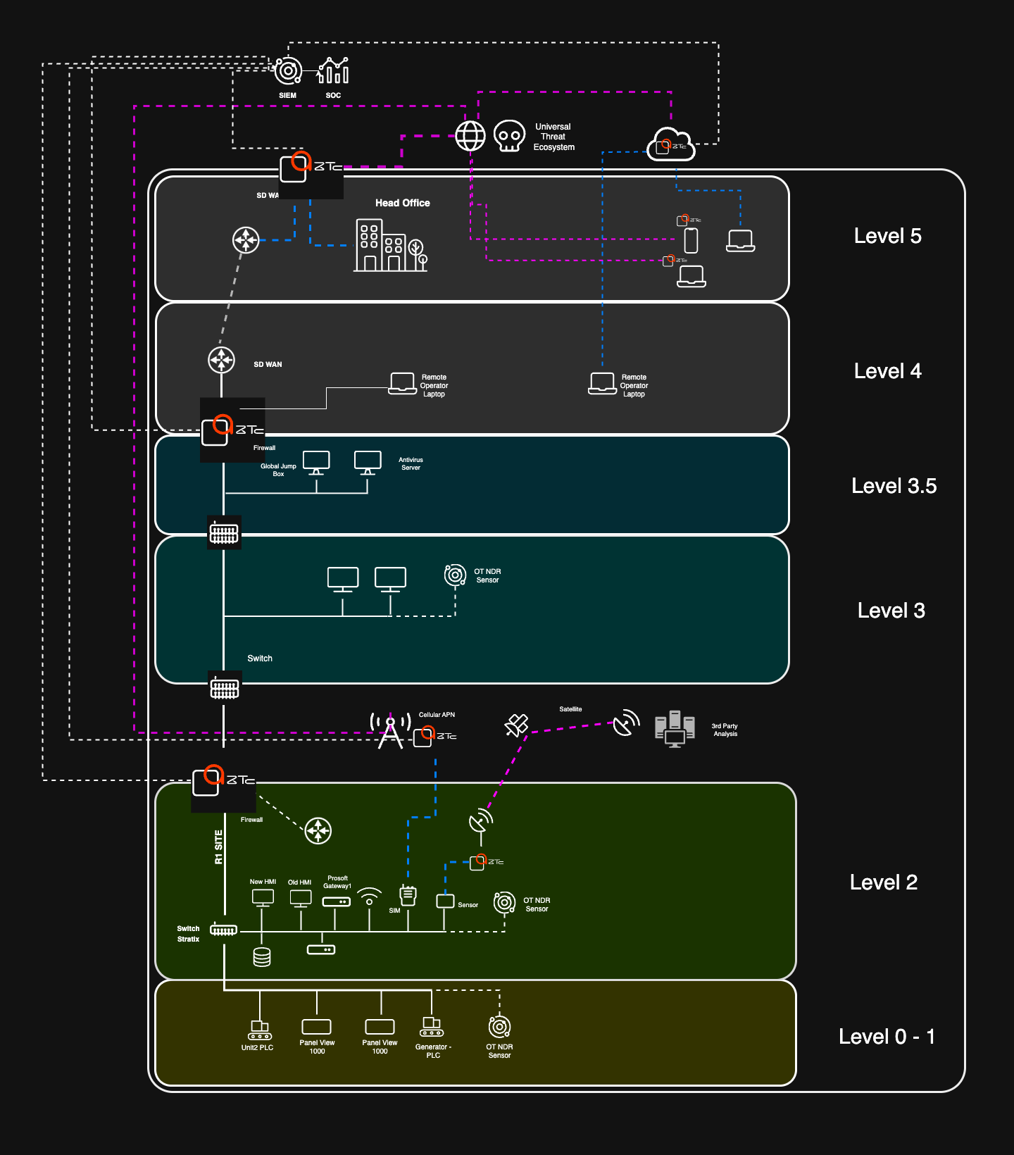 The core application would be covering IoT and IT in Level 5 but also ensure it exists between any potential internet connection and the organization. From there, distributing nodes down into lower Levels of IIoT and OT allows for centralized control over additional physical segments and layers as well as vastly enriched data feeds to SIEM / SOAR. East-West traffic within Levels is also controlled by segmentation from the ZTC gateway.