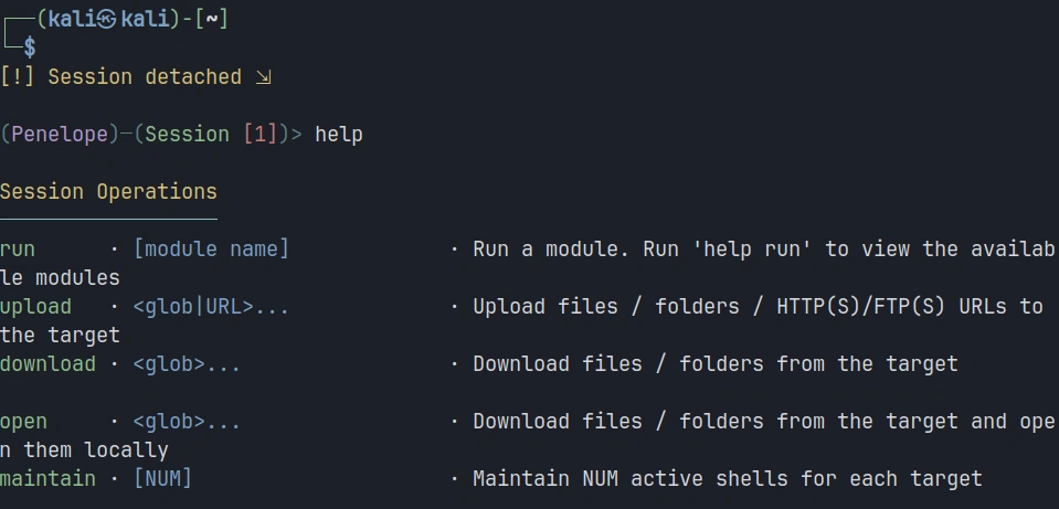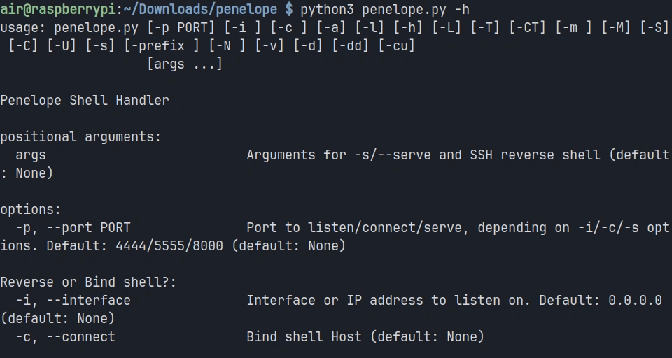 Once the downloading completes, you can verify that Penelope is ready to use by checking its help menu: