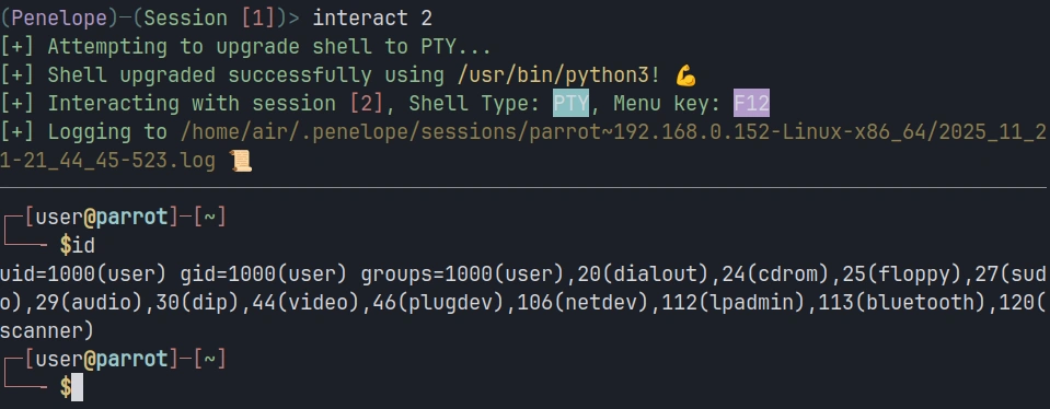 You should see Penelope display information about the new session, including an assigned session ID, the target’s IP address, and the detected operating system. The shell is automatically upgraded to a fully interactive TTY, meaning you now have tab completion, the ability to use text editors like Vim, and proper handling of special characters.