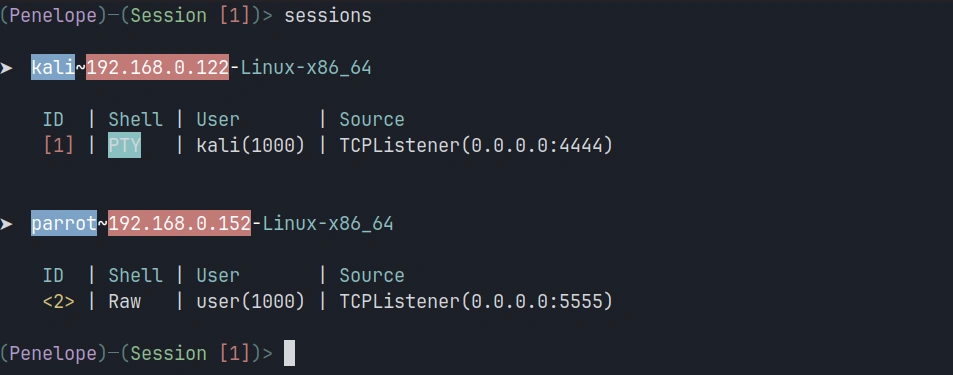 Each time a new target connects, Penelope assigns it a unique session ID and adds it to your session list.